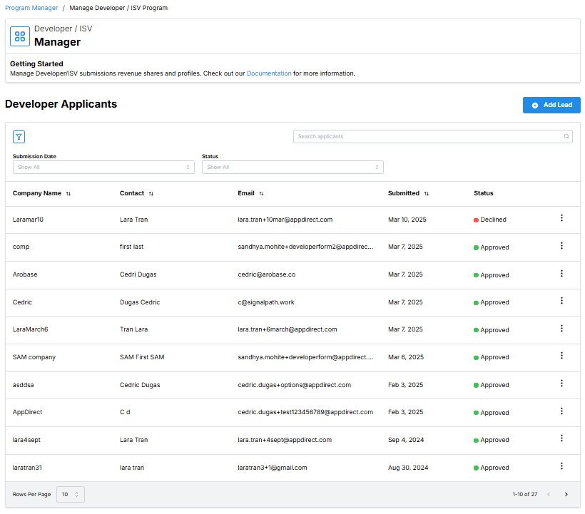 Click Manage in the relevant dialog box to manage the applicants for Developer/ISV program.The Manager page opens and the list of applicants with the following details is displayed: